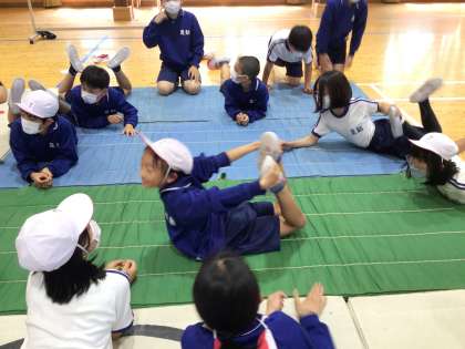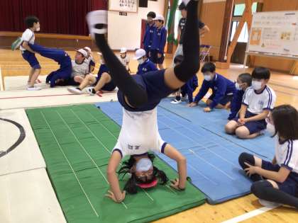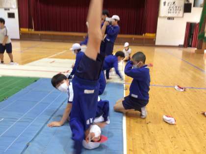 5・6年生 体育 マット運動 1 公開日 2024/06/11 更新日 2024/06/11 各学年から 6月11日(火)、5・6年生の体育はマット運動でした。 3点倒立やブリッジ、水平バランスなどに挑戦しています。