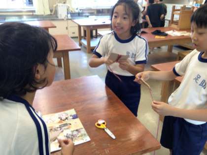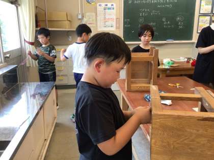 3年生 図工 ひもでつないで 公開日 2024/06/11 更新日 2024/06/11 各学年から 6月11日(火)、3年生は図工で、グループで協力し、空間にひもをつないだり、結んだりして作品を作りました。友達と相談してイメージを膨らませ、どんどん作り出しました。