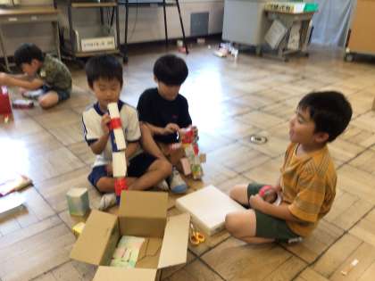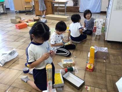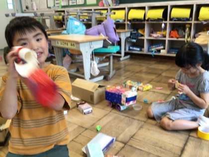 6月13日(木)、1年生はいろいろな形を組み合わせて、動物や遊び道具を作りました。「これを転がして」「くっつけて耳にしよう」などどんどん発想が広がり、楽しい作品ができました。