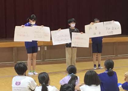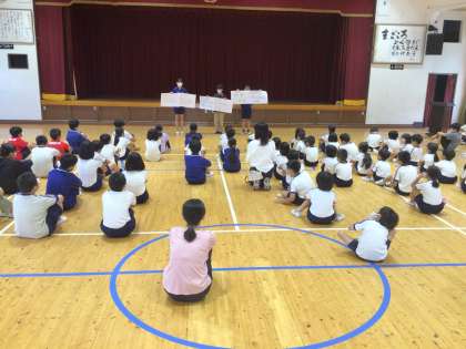 6月17日(月)、全校朝会で、図書委員会が読書週間について話しました。