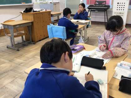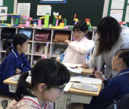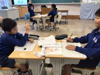 6月18日(火)、4年生は国語の学習で、グループで相談し、山場のある物語をつくっています。登場人物をどのように動かすか、どんな言葉を話させるのか、話し合いが進んでいました。