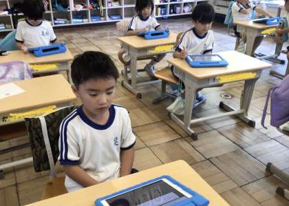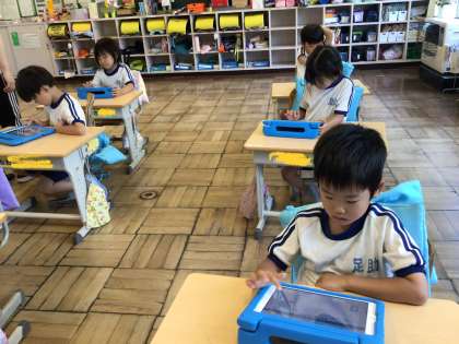 6月19日(水)、1年生も、ICT支援員さんと一緒にタブレットの学習です。自分の名前を入れています。