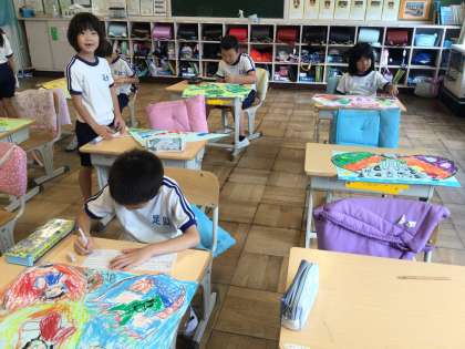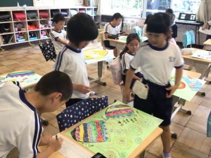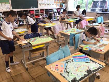 7月1日(月)、2年生は図工で、不思議なたまごをぱかっと割って出てくる世界を描いていました。虹の下の学校や海の世界、打ち上げ花火など楽しい世界が広がっていました。