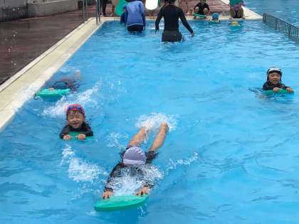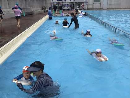 1・2年生 体 体育 ビート板でバタ足 公開日 2024/07/08 更新日 2024/07/08 各学年から 7月8日(月)、1・2年生の体育はプールです。ビート板でバタ足の練習をしていました。顔をつけて、ぐいぐい進んでいる子もいます。