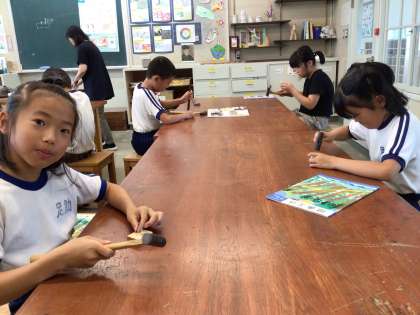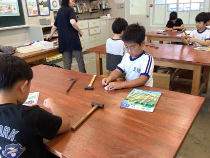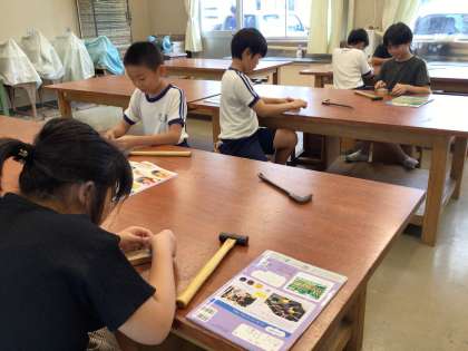 3年生 図工 くぎうちトントン 公開日 2024/09/03 更新日 2024/09/03 各学年から 9月3日(火)、3年生は図工で金づちをつかって、木の板に釘をトントン打ちつけていました。飾りをつけたり、毛糸で結んだりして、どんどんイメージが広がります。