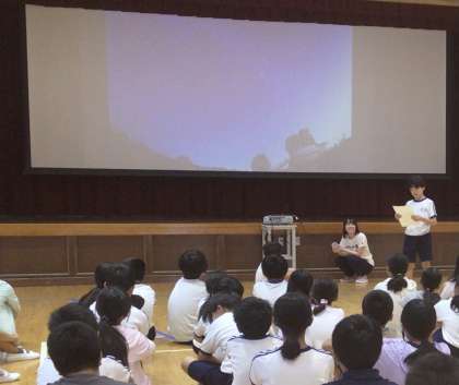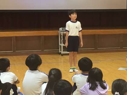 スピーチ集会 公開日 2024/09/09 更新日 2024/09/09 学校の特色ある活動 9月9日(月)、夏休みが明けて初めてのスピーチ集会です。2人の子が発表しました。夏休みの充実感が伝わる内容でした。また、聞き手もうなずくなどのリアクションをしながら、しっかりと聞くことができました。最後には、頑張った二人に拍手がおくられました。