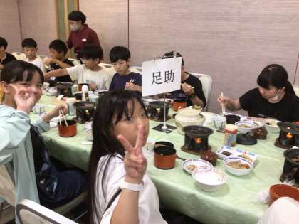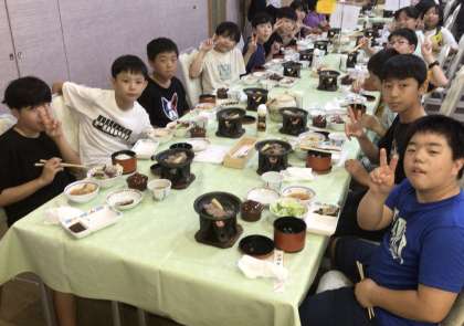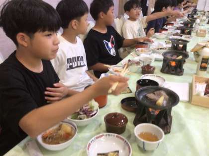 午後6時から夕食です。唐揚げ、ステーキ、肉じゃが、サラダ、グラタン、など。大満足な子どもたちです。