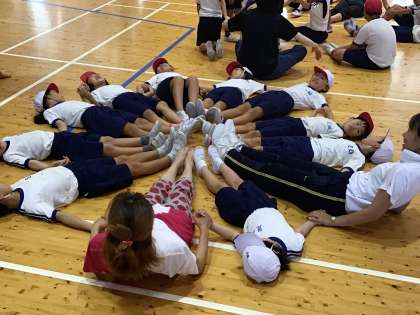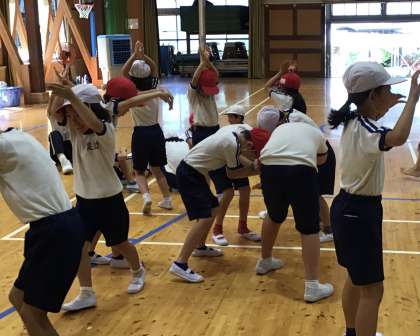 9月18日(水)、第3回のコミュニケーション能力向上事業を行いました。顔馴染みの講師の先生に元気に挨拶した子どもたち。前回のように視線と動作で友達に手拍子を送ったり、1人、ペア、グループで、いろいろなものを体全体で表現したりしました。