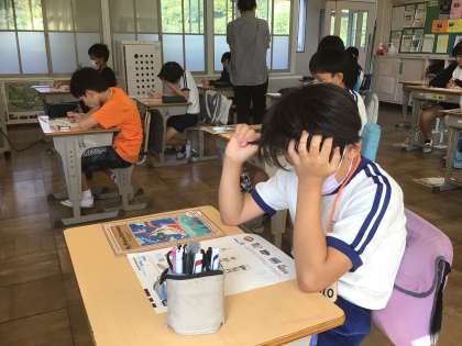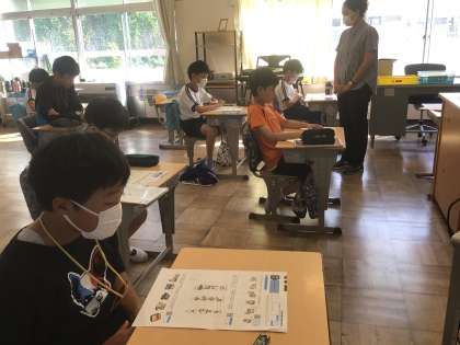 10月1日(火)、6年生は英語で聞き取りのテストを行っていました。 真剣な表情で聴く6年生です。