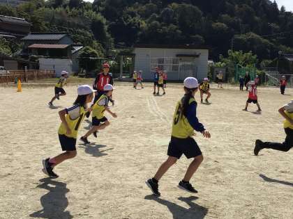 体育委員会 全校遊び 1 公開日 2024/10/11 更新日 2024/10/11 特別活動 前期最後の日、前期体育委員会が全校遊びを企画・運営しました。行ったのは、4色鬼ごっことアメリカンドッジボールです。 4色鬼ごっこは、違う色の鬼に捕まってその場で固まっても、自分の色の鬼にタッチされると復活するルールです。