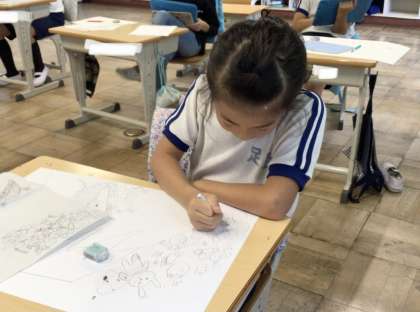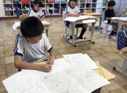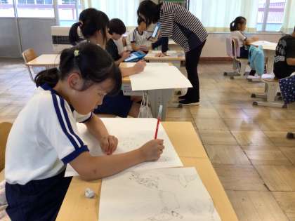 3年生 読書感想画 下書き 公開日 2024/10/22 更新日 2024/10/22 各学年から 10月22日(火)3年生の図工は読書感想画の下書きです。「ゴミをたくさん描かなくちゃ」と言いながら、富士山の横にゴミを書き足していました。独特な登場人物たちが活躍するお話のようです。