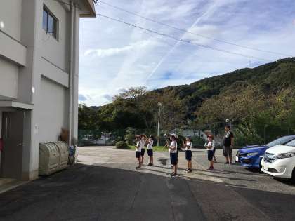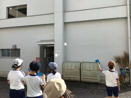 10月28日(月)、3年生は外で鏡を使った学習です。壁に向かって、光を動かしていました。「中に入った光を見に行きたい」と次の活動への意欲が広がっていました。