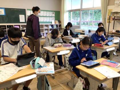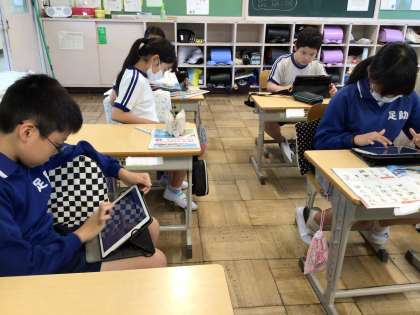 5年生 英語 マイ ヒーロープレゼンテーション 公開日 2024/10/29 更新日 2024/10/29 各学年から 10月29日(火)、5年生は外国語の学習で、タブレットを使って、マイ ヒーロー のプレゼンテーションを作っています。互いに相談し合い、例文や教科書を見ながら、英語を書いていました。