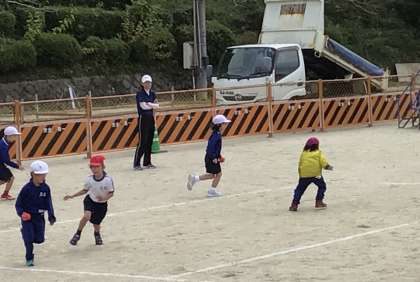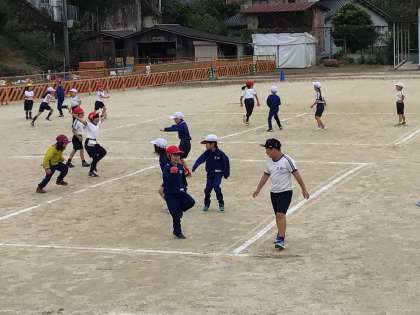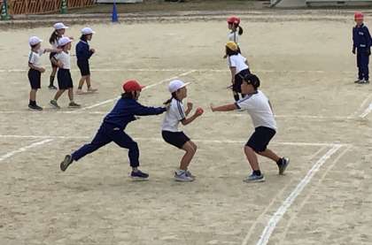 1,2年生の体育は「たからはこびおに」です。鬼に捕まらないように、球を運んでいきます。チームで作戦を考えて、たくさん運べるように工夫していました。