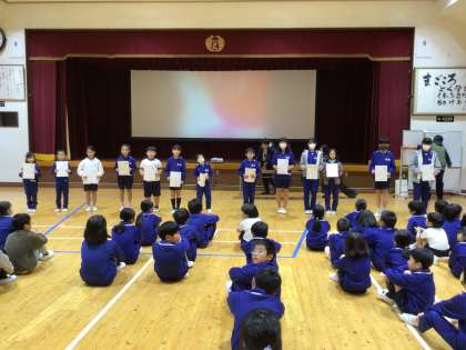 11月11日(月)、全校集会であすっこ賞の表彰を行いました。今回は、学芸会で素晴らしい演技を披露した子や裏方としてみんなを支えてくれた子、友達や先生の手助けを進んでしてくれた子など、多くのあすっこの素敵が表彰されました。