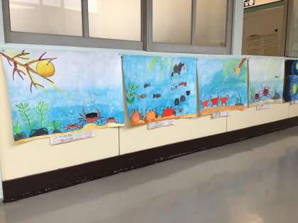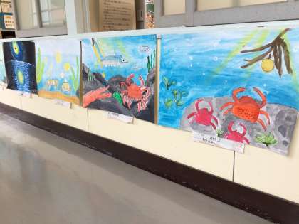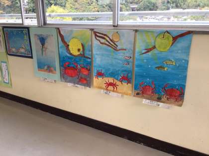 6年生の完成した読書感想画の掲示です。題材は、宮澤賢治さんの「やまなし」。水の中の風景をそれぞれ描き出しています。