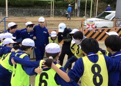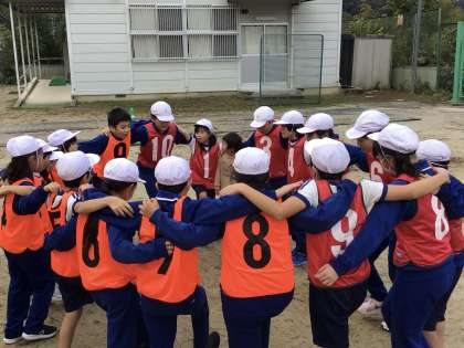 ゼッケンを着たみんなで、丸く輪になって、リーダーが気合の一言です。