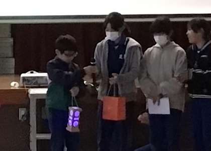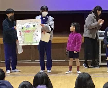 今回は、アート作品の披露もありました。大きなカエルの絵、色が変化して光る行灯、折り紙をたくさん組み合わせた作品に、カラフルな色で描かれた絵画。