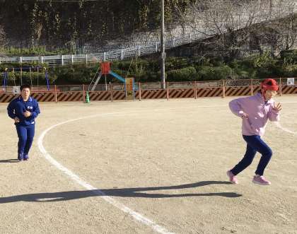 11月25日(月)、わくわく学級さんは、講堂でラジオ体操やダンスをした後、外で7分間走を始めました。止まらずに走り切れるように声と音楽をかけながら、がんばりました。