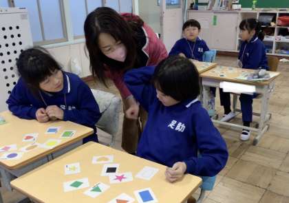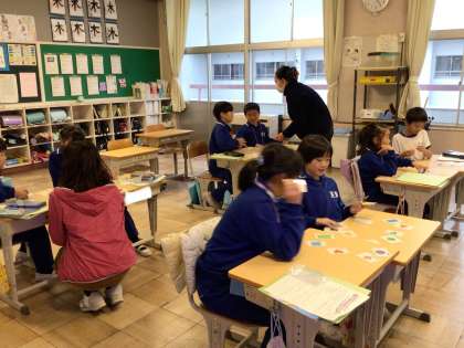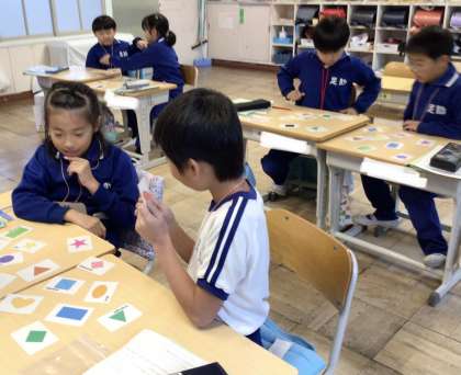 3年外国語活動 形と色 公開日 2024/11/26 更新日 2024/11/26 各学年から 11月26日(火)、3年生は今まで学習した形と色の英語を使ってゲームをしていました。ラッキーカードがどれか、考えながら、絵に合ったカードを英語で言って取っていきました。
