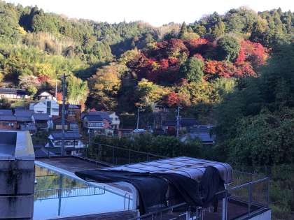 学校周辺の山々がやっと赤く色づいてきました。プールの水面に綺麗に映っています。