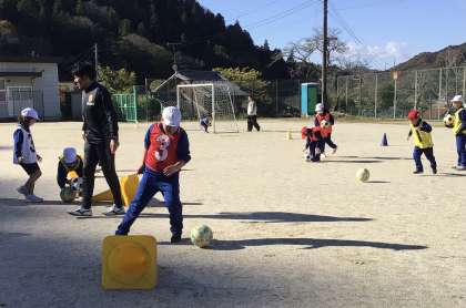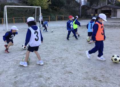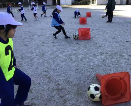 優しいボールタッチでのドリブルやストップなどにゲーム要素も加えて、1時間中体を動かしました。