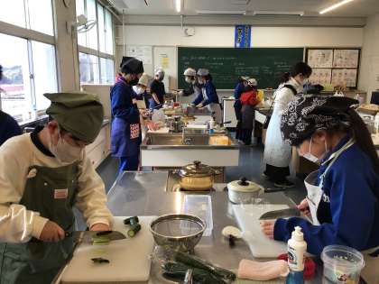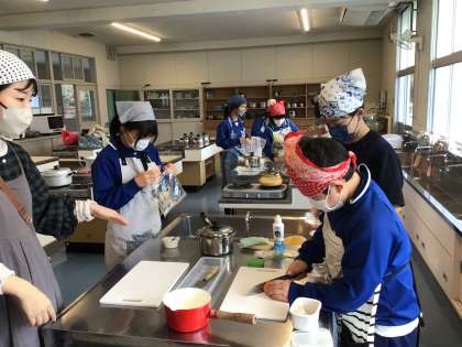 家庭科で学習したご飯とみそ汁に加えて、畑で採れたサツマイモも料理しました。みそ汁は、一人一人3種類の具材を家から持って来て、一人一鍋で作りました。