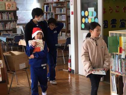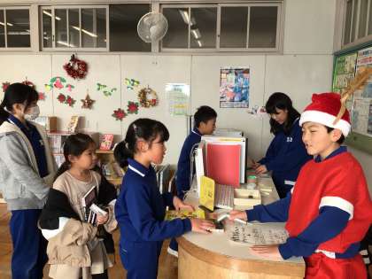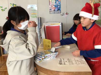 図書委員会 クリスマスアクション 公開日 2024/12/17 更新日 2024/12/17 特別活動 12月13日(金)から18日(水)まで、図書委員会が「図書委員会からのプレゼント」のクリスマスアクションを行なっています。本を借りた冊数だけ抽選券を渡して、抽選の当たり番号の子は、好きな本をリクエストすることができます。 12月17日(火)のあすっこタイムも本を借りる子たちで賑わっていました。