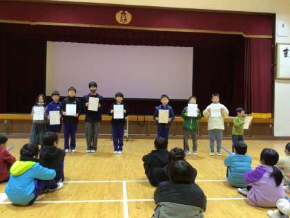 また、あすっこ賞の表彰もしました。駅伝大会に向けて、友達を引っ張ってがんばって走った子や下校後にも走っていた子など、自分ができる努力を続けた子たちやいつも気持ちいいあいさつを続けている子たちが表彰されました。