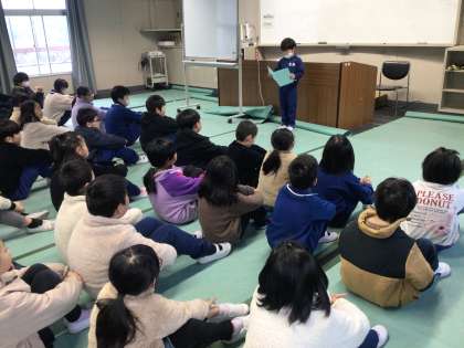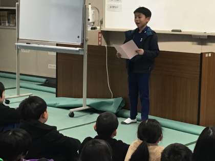冬休み明け集会 1 公開日 2025/01/07 更新日 2025/01/07 学校行事 1月7日(火)の朝は、全校集会からスタートしました。講堂はなかなか暖まらないため、今回はワークスペースで行いました。 まず、1・3・5年生の代表が、今まで頑張ってきた取組と新年からの目標を発表しました。 来年はお兄さんとしてがんばりたいという気持ち、高学年として委員会に取り組むために残り3か月は学級代表としてがんばる決意などを堂々と発表しました。