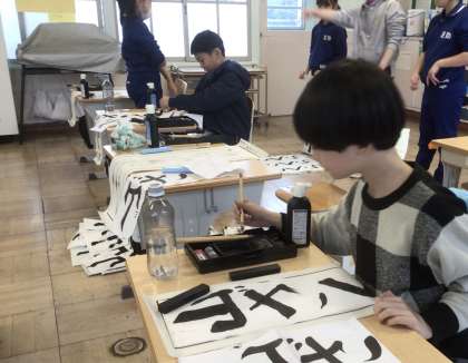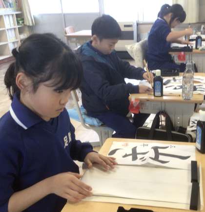 3年生は、初めての毛筆に挑戦です。筆を手に、真剣な表情で取り組んでいました。