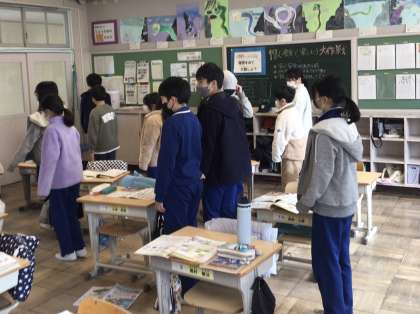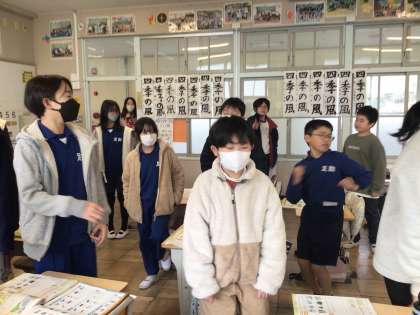 1月9日(木)、5年生の外国語の学習で、英語の指示を聞き取って、まっすぐ進んだり、右や左に曲がったりしていました。最後は目を瞑って動きます。みんなしっかりと聞き取り、そろって動く姿が素敵でした。