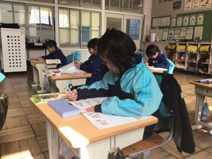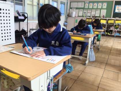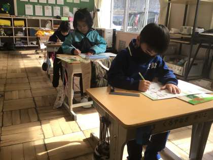 1月10日(金)、1年生は書写で、学習した漢字を美しく書けるように練習です。先生が「書き初めが終わったら、またすごく上手になっています」とほめてくださいました。姿勢も字も集中力も花マルの1年生でした。