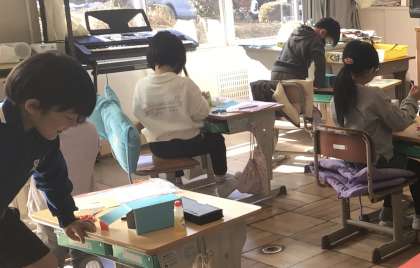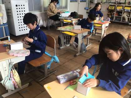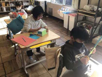 1月16日(木)、1年生は箱を組み立て、自分のイメージするものになるように飾りをつけて、ロープをビューンと走らせる工作です。友達の作っている様子を見て、何になるかを考えながら作っていました。