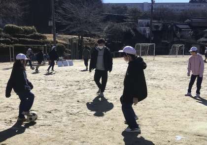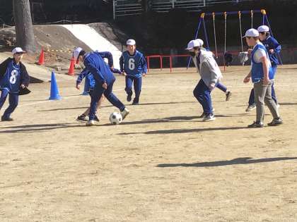 1月22月(水)、5・6年生もサッカーです。ゲーム形式の練習をしています。高学年はさすがの迫力です。