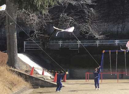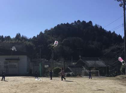 1月22日(水)、5・6年生が体育でサッカーをしていると、1年生が手作り凧を持って、凧揚げにやってきました。子どもたちの全力の走りと程よい風で、青空に凧がすいすい上がっていました。