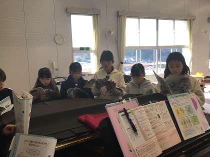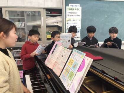 4年生 音楽 旋律を重ねて 公開日 2025/01/23 更新日 2025/01/23 各学年から 1月23日(木)、4年生の音楽は、リコーダー練習の後、合唱です。二つの旋律を重ねて響かせるように歌っていました。全く別の旋律なので、少し違う旋律の音に引っ張られてしまうときもありましたが、互いの歌がぴったり合うと、とても素敵な歌になっていました。
