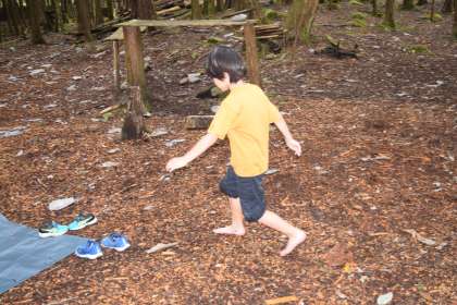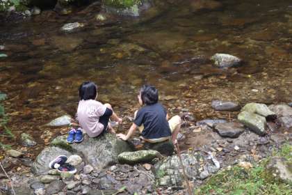 1年生が地域学習として、学区の金蔵連地区へ行きました。美しい森林や上流のきれいな川の中で自由に遊びました。裸足で落ち葉の上を歩いたり、冷たい川の水を感じたりしました。