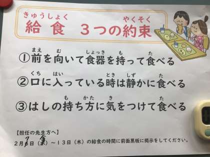 放送後は、各学年に健康委員から給食のルールについて話をしました。今日、伝えたのは3つの約束です。みんなが気持ちよく給食が食べられるように、気を付けたいですね。