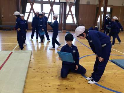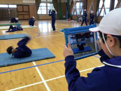 3・4年生 体育 マット運動 公開日 2025/02/13 更新日 2025/02/13 各学年から 2月13日(木)、3・4年生は体育のマット運動で互いに動画を撮影し合って、自分の前転や後転の様子を確認していました。動画は、スローで再生できるので、頭に手に付き方などがよく分かります。