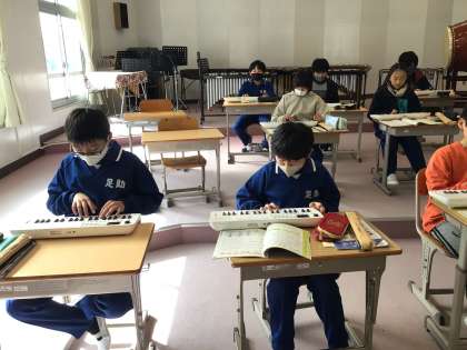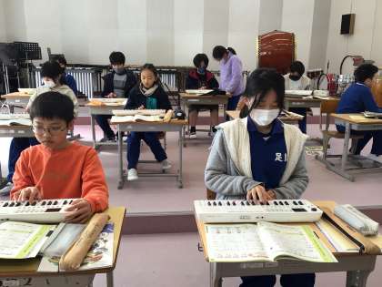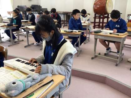 5年生 音楽 合奏 公開日 2025/02/17 更新日 2025/02/17 各学年から 2月17日(月)、5年生は音楽で曲の伴奏を和音で弾いていました。楽器の数が不足していたら譲り合ったり、困っていたら、教えてたりしながら、みんなで音をそろえている姿が印象的でした。