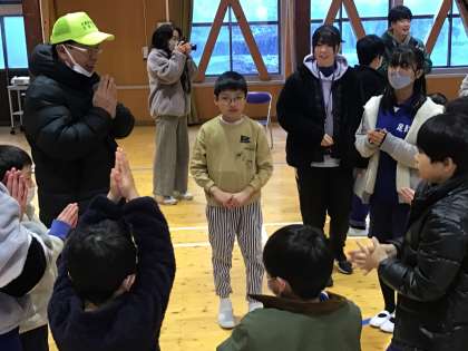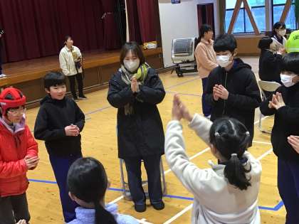 最初のゲームは、「たけのこにょっき」です。グループごとに、心を合わせて15にょっきまでつなげていきます。