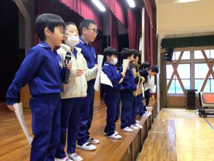 2月26日(水)、1・2年生は6年生を送る会の練習を講堂で行っていました。それぞれ、言うこと、することがあります。6年生に喜んでもらえるようにがんばっていました。