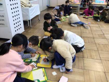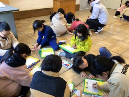 2月27日(木)、低学年のトークトレーニングは、マスの中に書いてある記号をグループの子に言葉で説明していく活動です。友達に伝わるように一生懸命言葉を考える説明する子と、どこのマスに何を書くかを必死で考えながら聞く子のチームワークで、大正解でした。