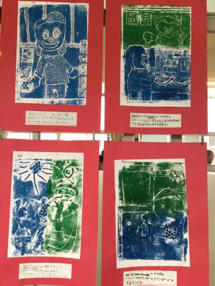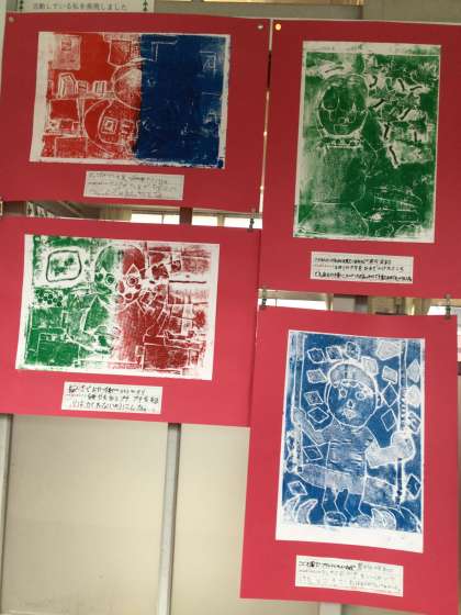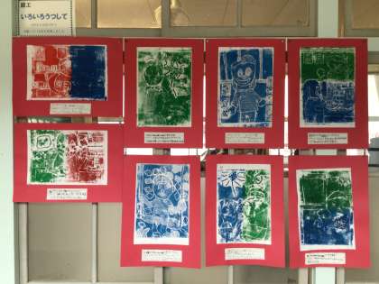 3年生の紙版画の作品が廊下に掲示されています。カラフルで、見ていると楽しくなります。