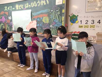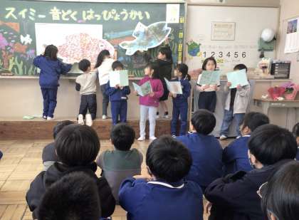 3月21日(金)、1年生が先生たちや3年生、5年生を招いて、国語で学習した「スイミー音読発表会」を行いました。