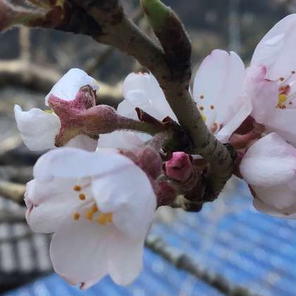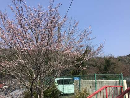 校門横の桜が咲きました。いつもより少し早い春の訪れです。ウグイスも鳴き、ツバメも青空を飛んでいます。