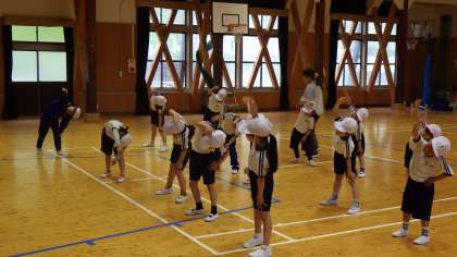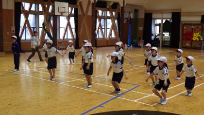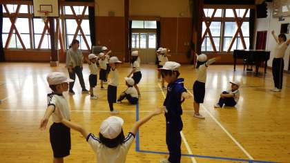 運動会に向けて、ラジオ体操の練習をしました。2年生は、1年生に手本を見せてくれました。