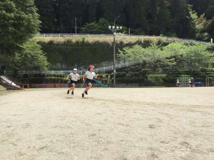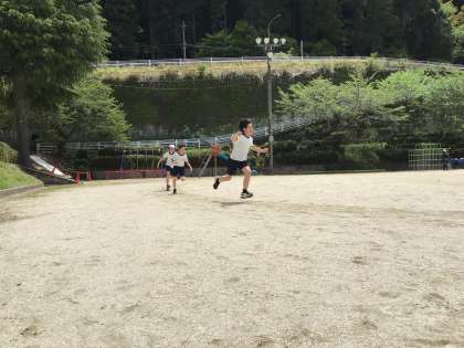 運動場に150メートルトラックができました。コーナーも使って、全力で走っています。