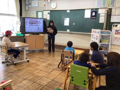 保健だよりを大型テレビにうつして、よい姿勢の確認をしています。